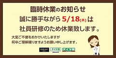 本日5/18(木)は社員研修の為臨時休業となります。 明日5/19(金)からは通常通り営業いたします。 営業時間 10:30〜19:00 最終作業受付 18:30 まで
