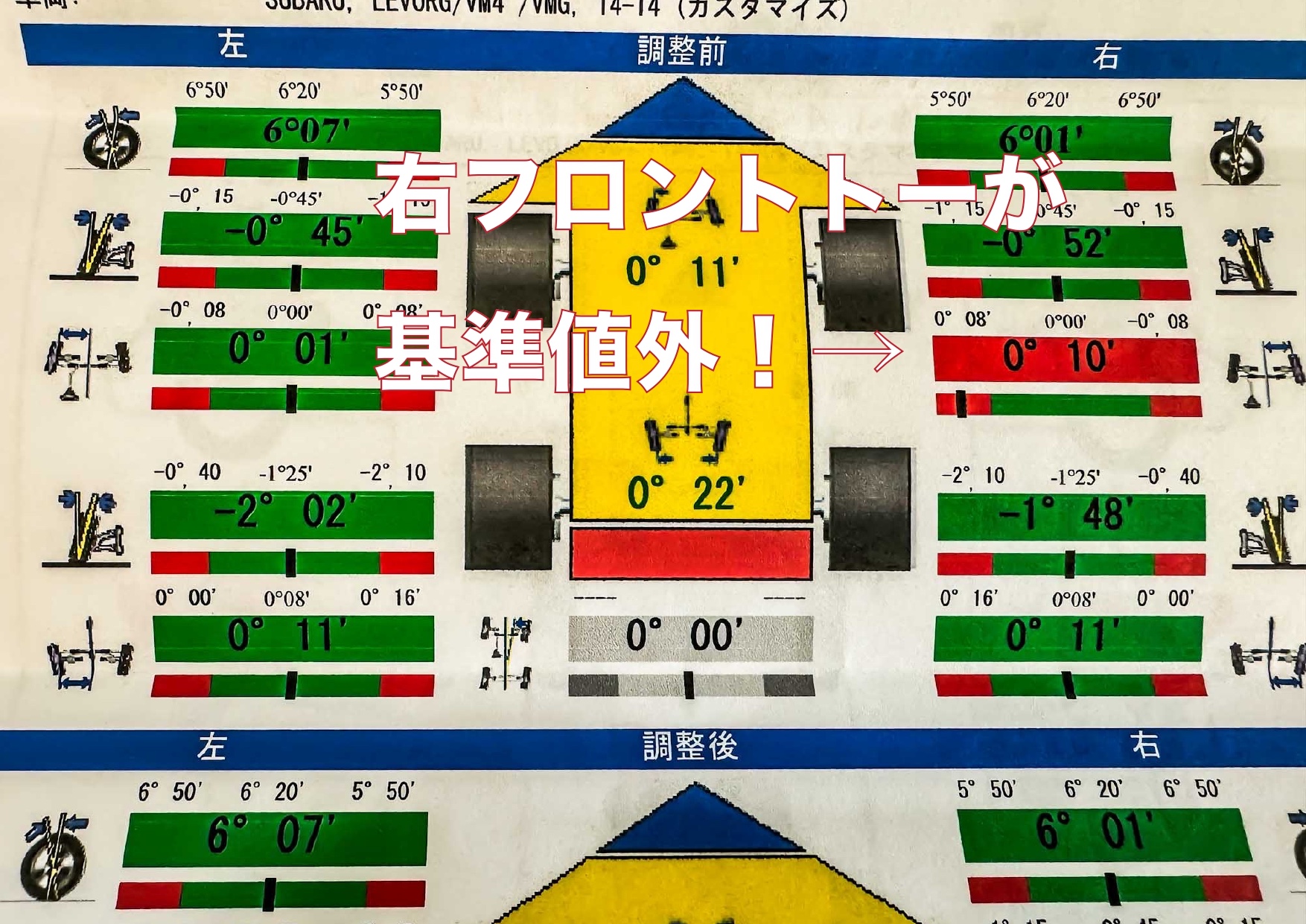 予想通り、右フロントトーが基準値外に!