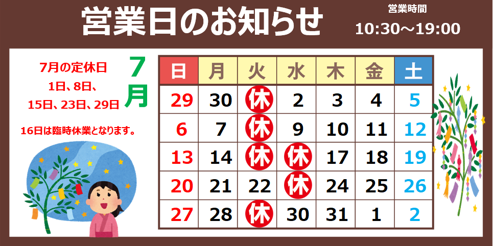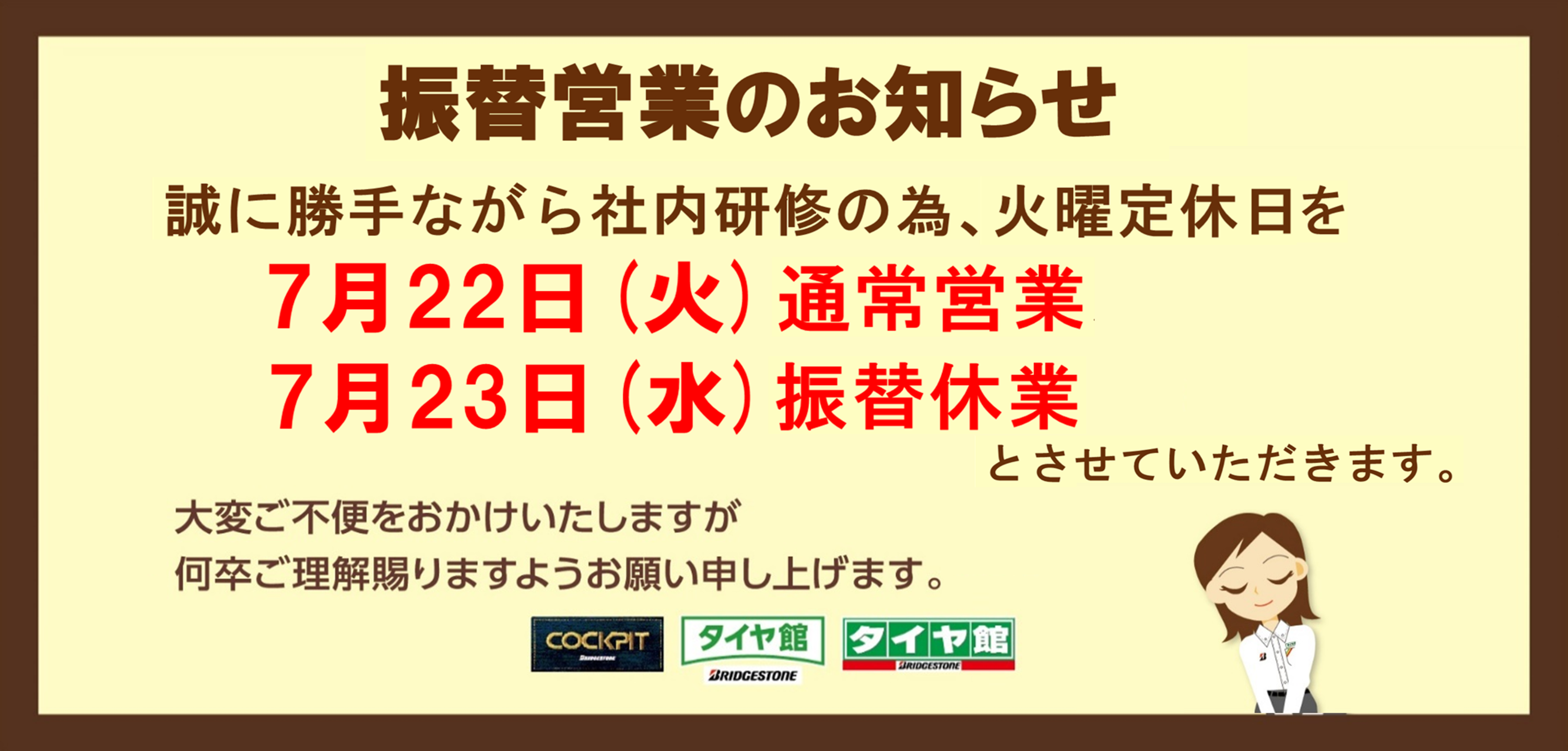 7月の営業日のお知らせ。 2025年7月4日 7月の定休日は、1日、8日、15日、16日、23日、29日です。 7月は、22日(火)は営業させていただき23日(水)お休みさせていただきます。 ご来店希望のお客様はお間違えの無いようご注意ください。 営業時間は、 10:30~ 19:00 となっております。 夏タイヤへの交換がまだお済みではない方やオイル、バッテリーなどの メンテナンス商品の点検・交換もお待ちしております。