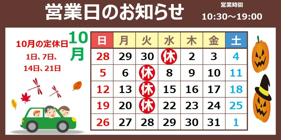 10月の営業日のお知らせ。 2025年10月1日 10月の定休日は、1日、7日、14日、21日です。 10月は1日(水)がお休み、28日(火)は営業日となっておりますので ご来店希望のお客様はお間違えの無いようご注意ください。 営業時間は、 10:30~ 19:00 となっております。 いよいよタイヤ交換の時期が迫ってまいりましたね! 10月後半から11月は大変混み合うことが予想されますので タイヤの購入をご検討の方はお早めに!! 今月も皆様のご来店をお待ちしております!