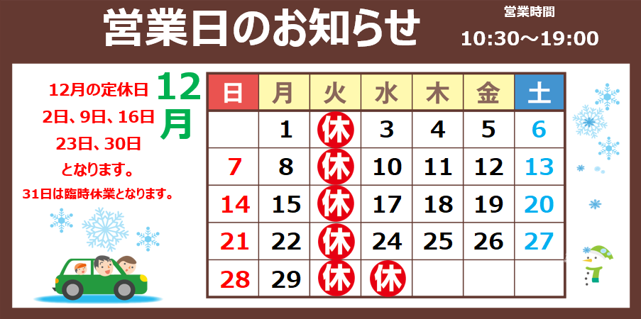 12月の営業日のお知らせ。 2025年12月1日 12月の定休日は、2日、9日、10日、16日、23日、30日です。 12月は、31日(水)お休みさせていただきます。 ご来店希望のお客様はお間違えの無いようご注意ください。 営業時間は、 10:30~ 19:00 となっております。 今年もわずか1カ月となります。 来年もタイヤ館秋田をよろしくお願いいたします!! 今月も皆様のご来店をお待ちしております!