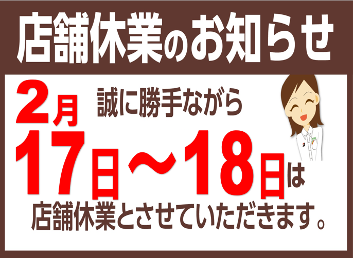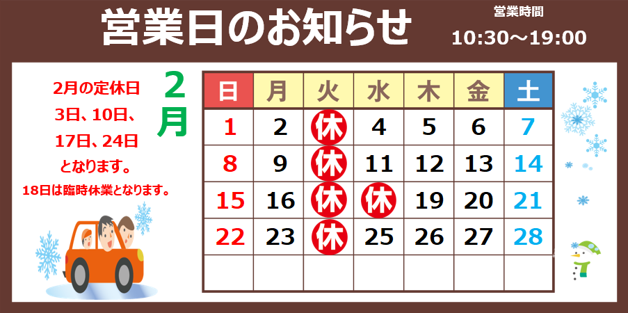 2月の営業日のお知らせ。 2026年2月1日 2月の営業日のお知らせです。 今月は11日の建国記念日、23日天皇誕生日は営業日となります。 また17日18日は誠に勝手ながら連休とさせて頂きます。 ご来店の際はお間違えのないようお願い申し上げます。