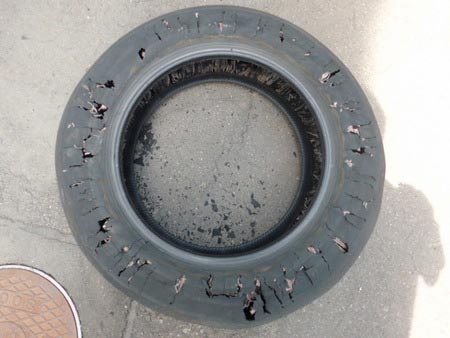 なんと、パンクしてタイヤがボロボロの状態じゃありませんか(((((( ;゚Д゚)))))