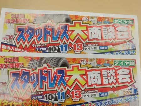 こんにちは、10月11、12、13日、3日間開催のスタッドレス商談会をやります。