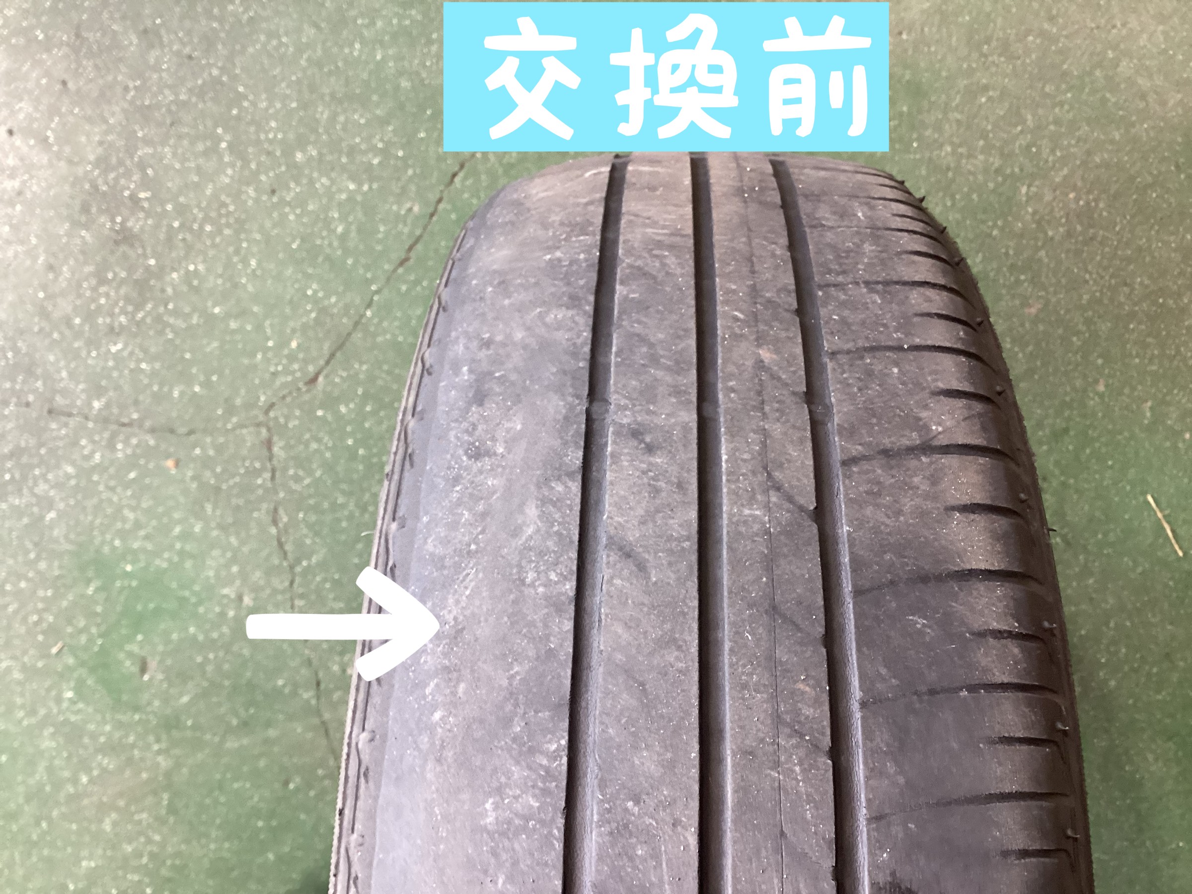 交換前のタイヤ、ショルダー面、トレッド面ともに減っています!