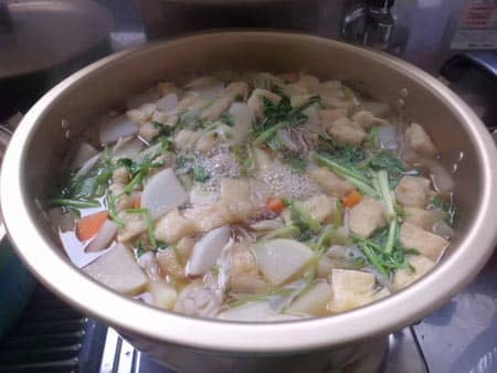 大きな鍋に出汁をとって材料を煮込み味付けして、