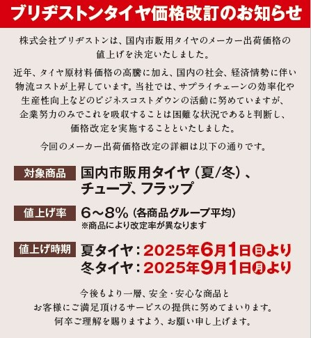 ※ブリヂストンは、国内市販用タイヤのメーカー出荷価格の値上げを決定いたしました。