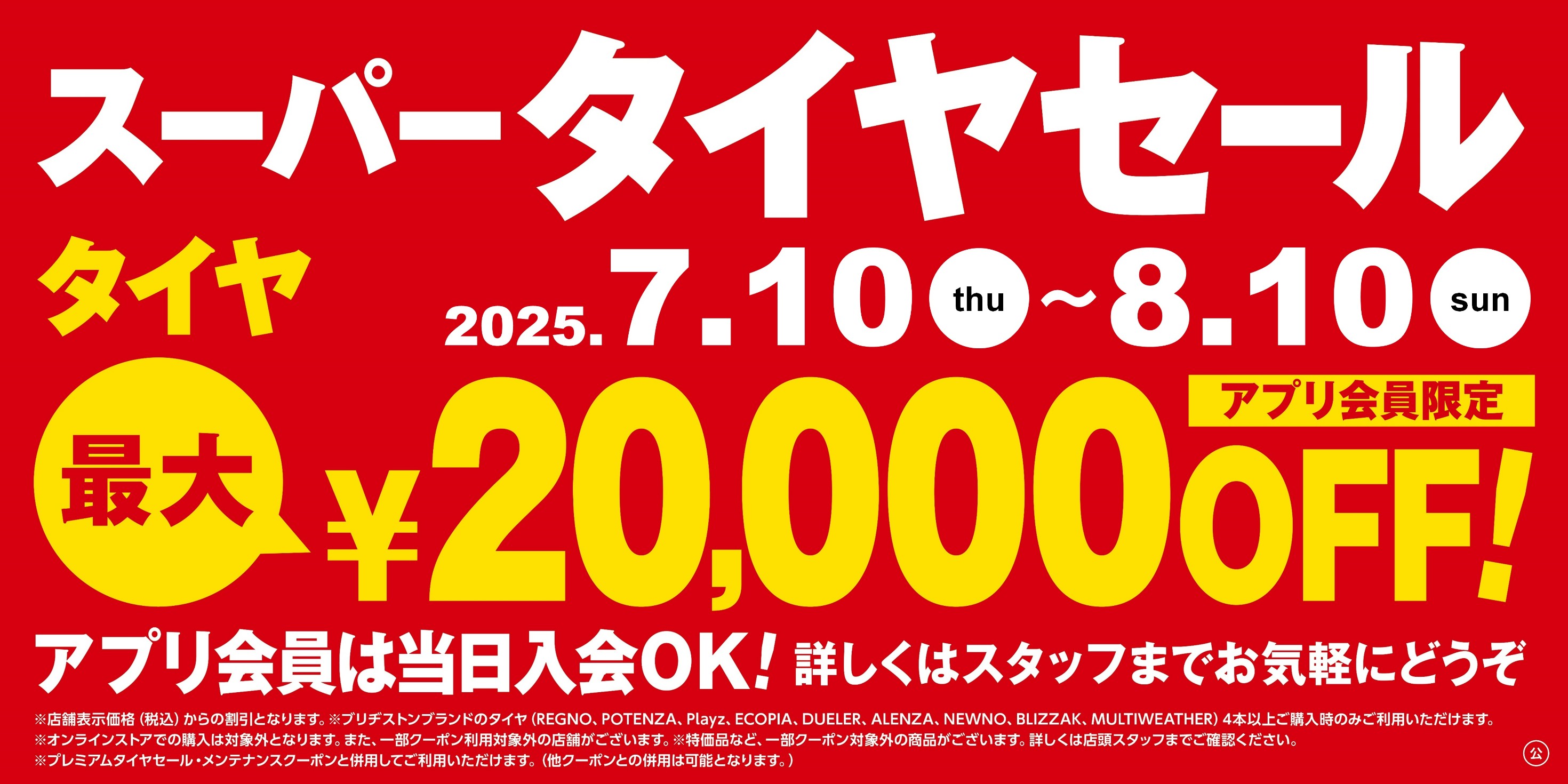 コクピット・タイヤ館アプリをお持ちの方限定でタイヤ最大20,000円引きクーポンを配信中!