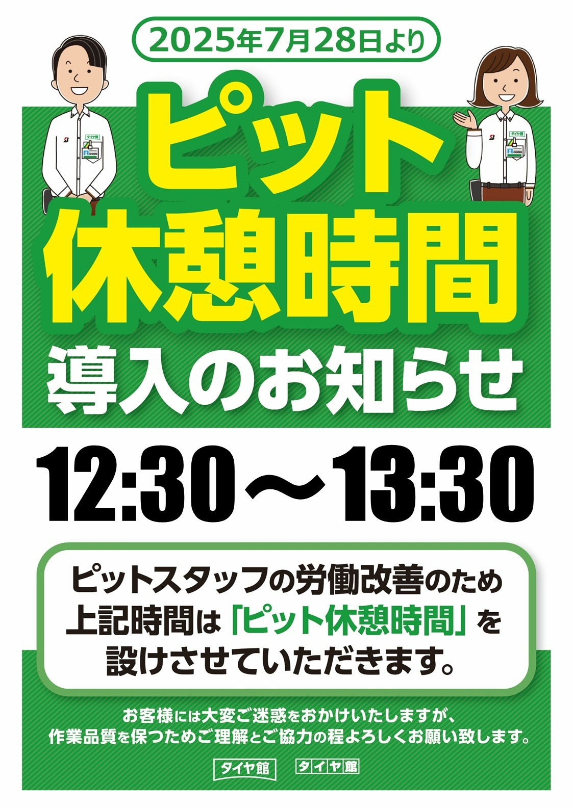 本日7月28日から「ピット休憩時間」を設けさせていただきます。