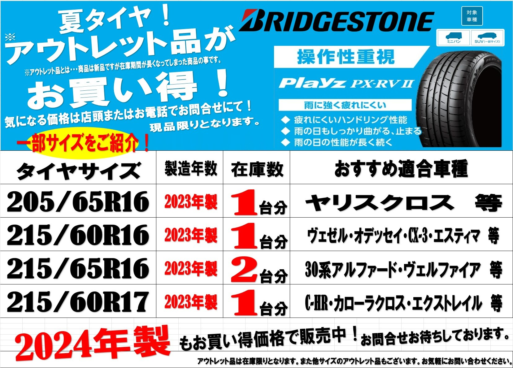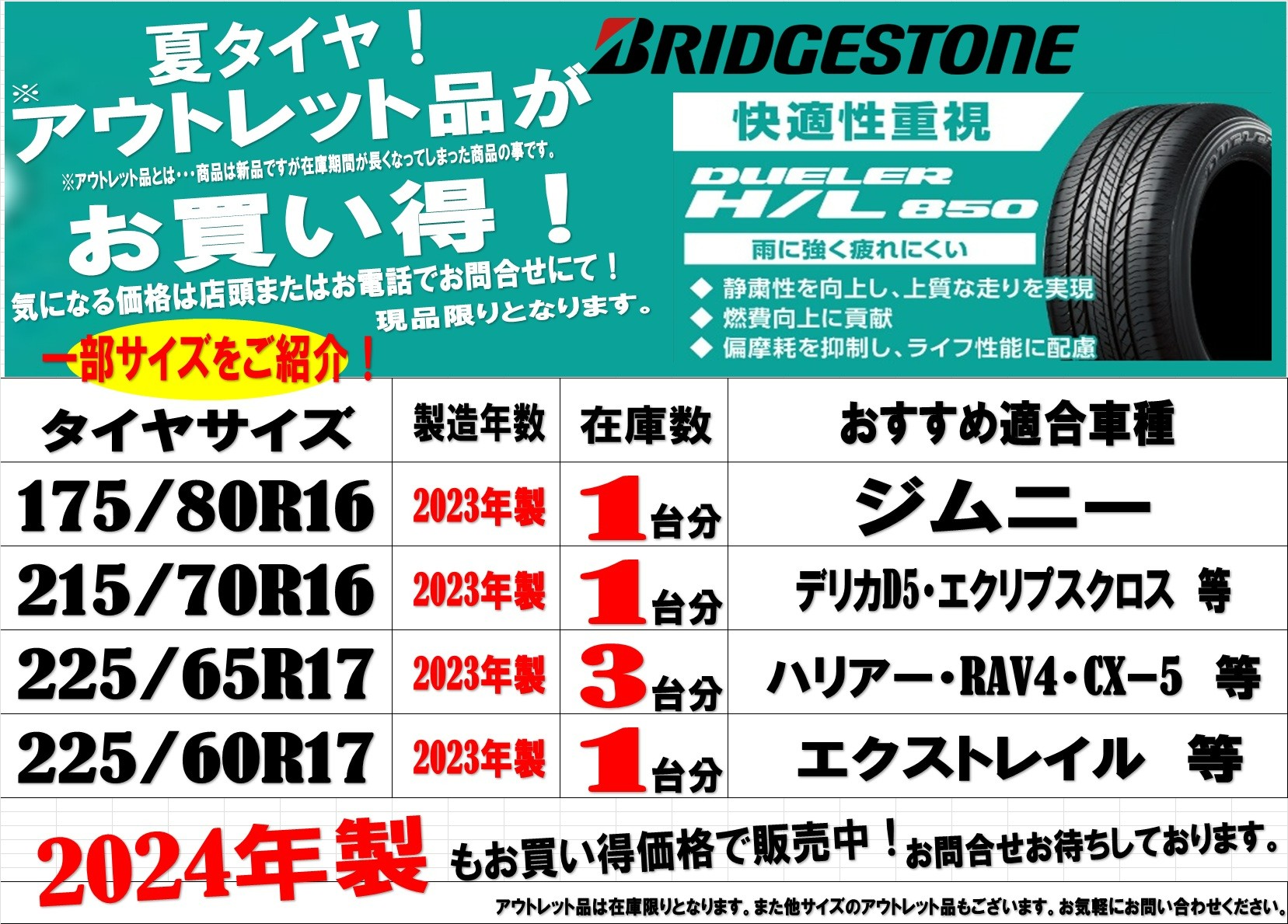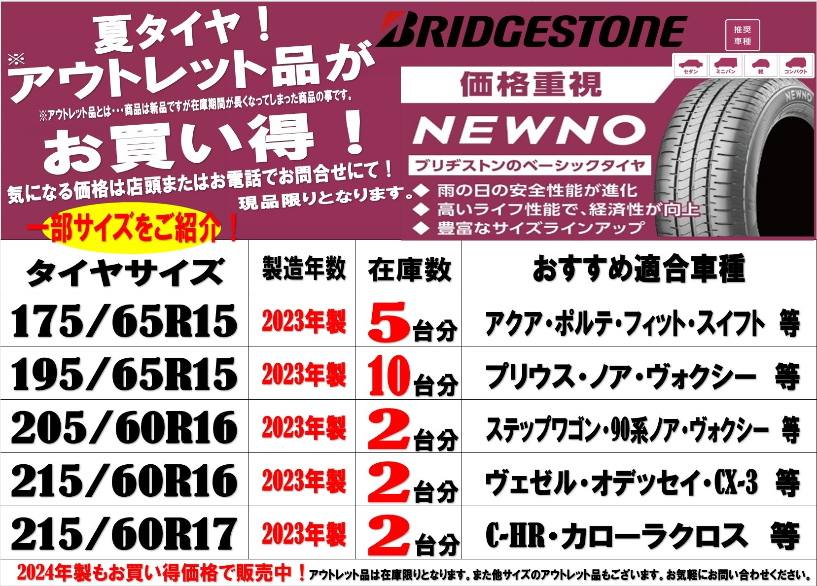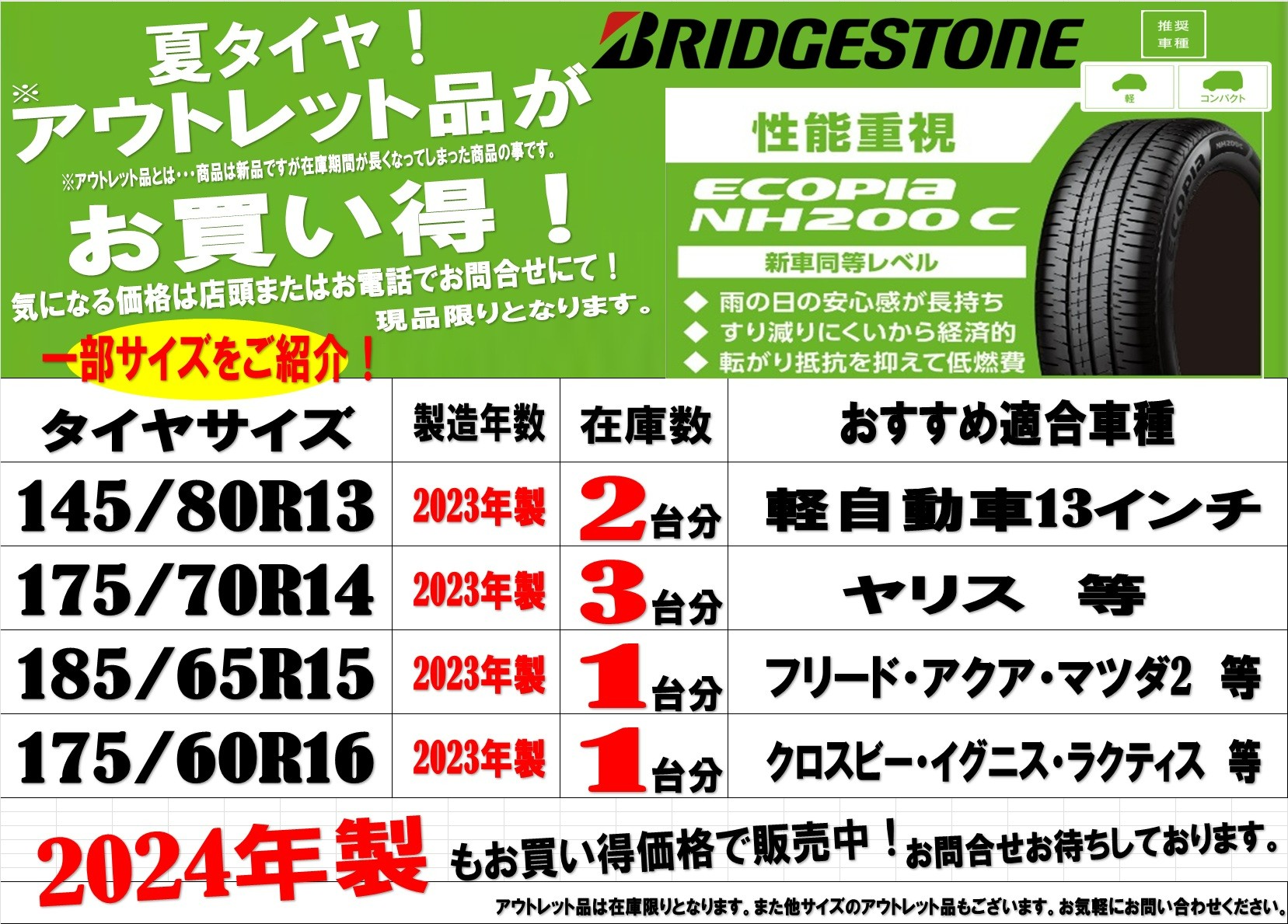 現品限り!夏タイヤ「アウトレット商品」のご紹介!とってもお買い得です!