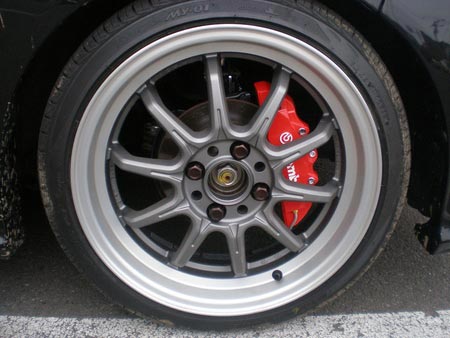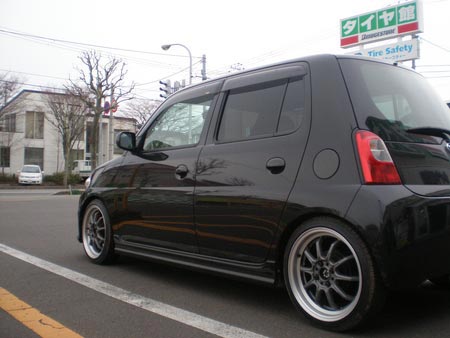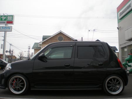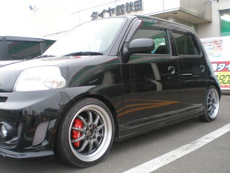今回はエッセにグラムライツ・ゴーナナ・ヴィンテージを装着しました!グラムライツは鋳造ホイールですが、スポーツ車をターゲットにしていることもあって比較的軽量に作られています!ホイールの奥にブレンボのキャリパーがどっしりと腰を据えて存在をアピールしてますね!タイヤはブリヂストンのMY-01をお選びいただきました!