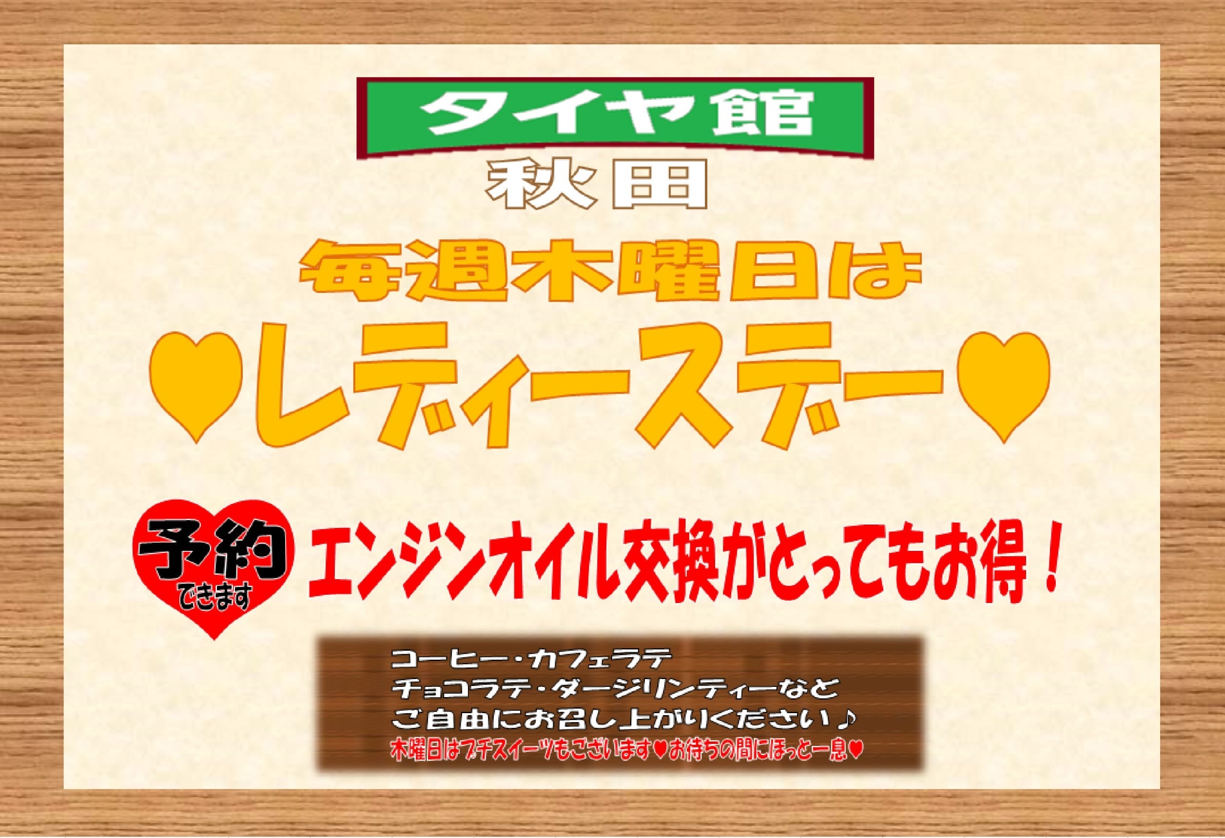 ★毎週木曜日はレディースデーです★ ポスト 2017年7月13日 明日はレディースデーです!! エンジンオイル交換がとってもお得に出来る木曜日♪ 女性のお客様であれば車種は問わずお得に交換できますので お気軽にお立ち寄りください☆ コーヒーや紅茶の他にチョコラテやカフェオレなどのドリンクサービスや 木曜日限定でプチスイーツもご用意しております(*^^*) _U~~ タイヤ館秋田は「こどものえき」にもなっています♪ おむつ交換台やチャイルドコーナーも完備しているので 小さなお子様連れのママも安心してご利用して頂けます(*^_^*) 女性スタッフもいますので、初めての方も1人でのご来店も安心です♥ ぜひお気軽にご利用ください(^^♪ カテゴリ:お知らせ