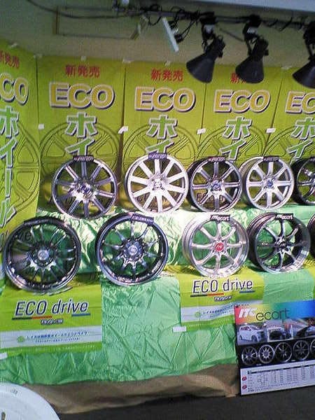 さて、展示会の方ですが、今はECOホイールといって軽量ホイールのバリエーションも増えてますし、従来通りのインチアップ系の新作も展示されてましたね!