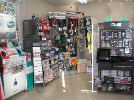 店内の奥のほうにはオーディオや用品などを集約させています!よくお客様に「タイヤ館はタイヤしかないの?」と聞かれることが結構あるのですが、そんなことはないですよ!!オイルやバッテリー、ワイパーなどのメンテナンス用品やライトのバルブなどの小物商品もありますよ!