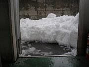 ピットから外に出るドアのロックをはずして開けようとしたらまったく動かず、回り込んでみたら屋根から落ちてきた雪でドアの開くスペースが見事に埋もれていました。スコップを持ってきて雪寄せ開始です!とりあえず、ドアの開くスペース分は確保しました。寄せた黒い部分が地面なので写真の雪の高...