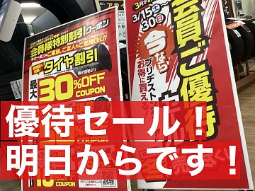 3月になり春の足音が聞こえ始めてきましたね! 当店では3/15(土)~3/30(日) 会員ご優待セールを開催いたします! 日頃当店をご利用のお客様に感謝の気持ちを込めて、 夏タイヤはもちろん冬タイヤ、アライメント調整、カーメンテナンス商品を 会員様限定のお買い得価格でご提供! また、各種アウ...