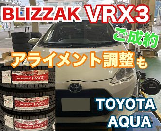[車種]TOYOTA AQUA [作業内容]新品タイヤ交換、アライメント調整 今回はアクアのタイヤ交換とアライメント調整をご紹介します! ご成約いただいたタイヤは「BLIZZAK VRX3 175/65R15」です。 VRX2からさらに進化した「VRX3」 氷上ブレーキ性能アップでしっかり止まる、曲がる。 摩耗ライフ向上で経済...
