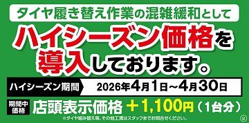 こんにちは!秋田市八橋のタイヤ館秋田です! 当店では毎年、タイヤ交換の季節の混雑緩和のために ハイシーズン価格を導入しております お客様にはご不便をおかけしますが 何卒、ご理解ご協力をいただけますようお願い申し上げます。