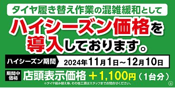 タイヤ履き替え作業の混雑緩和の目的の為、 タイヤ交換料金のハイシーズン価格を導入いたします。 【期間】2024年11月1日(金)~2024年12月10日(火) 【期間中価格】 店頭表示価格 +1,100円(1台分) お客様にはご迷惑をおかけいたしますが、 何卒ご理解賜りますようお願い申し上げます。 ーーーーーー...