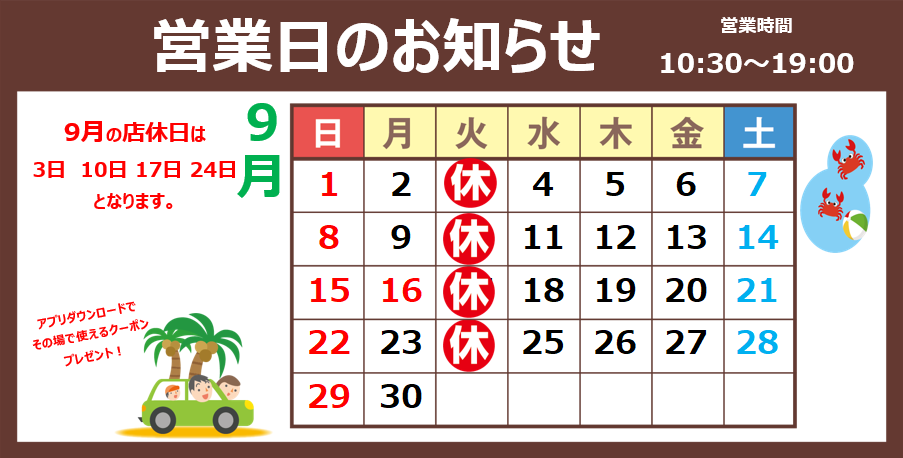 2024年9月 営業日のおしらせです!! 今月は3日、10日、17日、24日が定休日です。 もう少し暑い日が続きますがトラブルがないように お出かけ前の点検はいつでも大歓迎です★ ーーーーーーーーーーーーーーーーーーーーーーーーーーー タイヤ館秋田 〒010-0973 秋田県秋田市八橋本町3-8-7 (Google M...