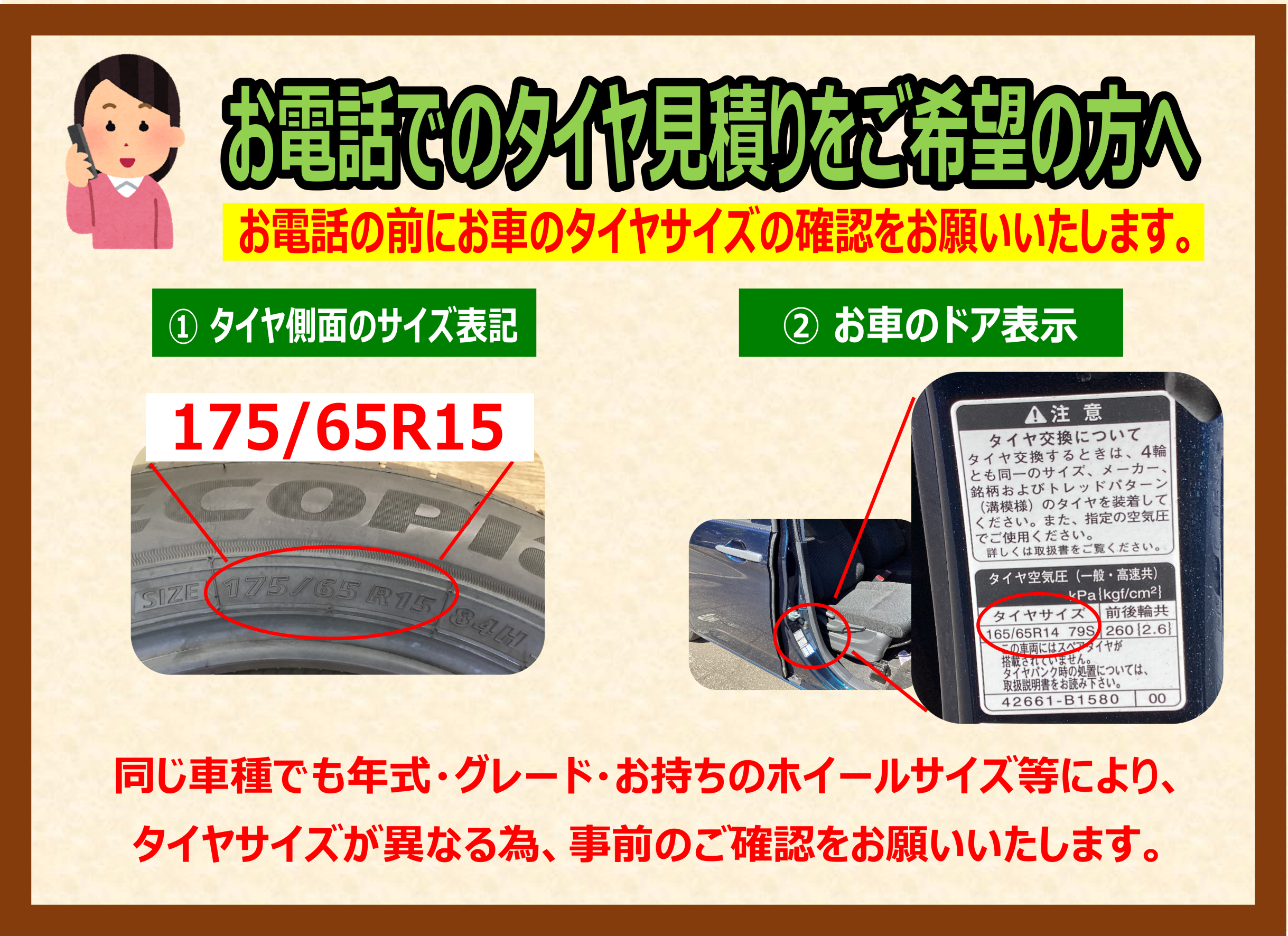 お電話にてタイヤのお見積りも大歓迎です★ しかしお電話でタイヤのお見積りをする場合、 車種のみだと年式・グレード、お持ちのホイールサイズ等により タイヤサイズが異なり価格のご提示ができませんので、 事前にタイヤサイズのご確認をお願いいたします!! タイヤサイズの確認方法は主に2つあり...