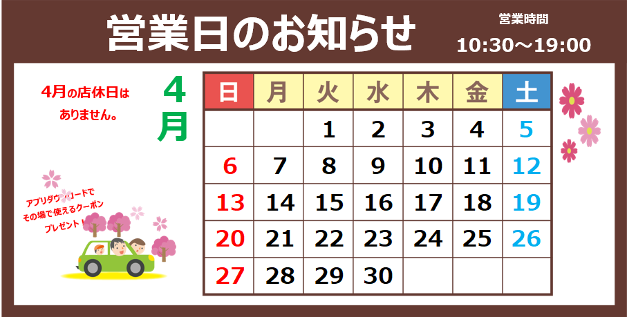 2025年★4月営業日のお知らせ★ 2025年4月1日 2025年4月営業日のおしらせです!! 今月は通常火曜定休日のところ、 毎日休まず営業いたします!! 4/1現在 平日を中心に空き枠がございます!! WEBでの空き枠がない場合、お電話でお問い合わせください!! お電話でお問い合わせいただければ、可能な範囲内で対応させていただきます!! たくさんのご来店をお待ちしております!!