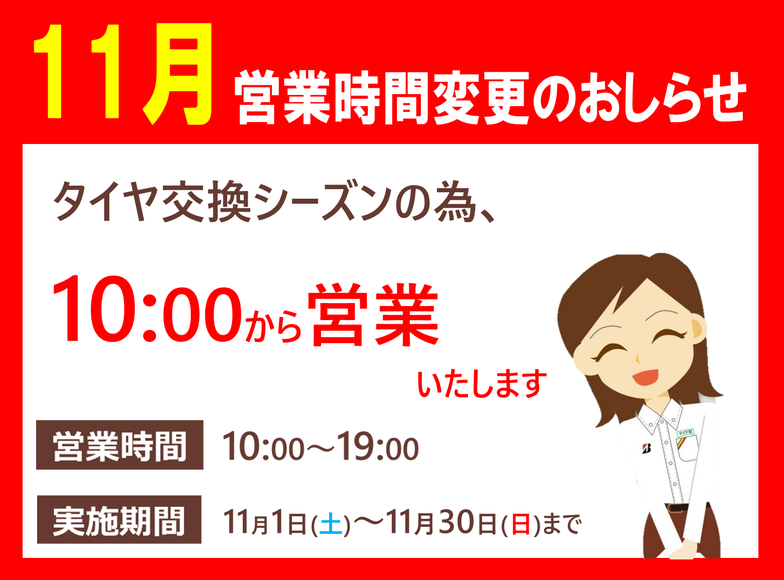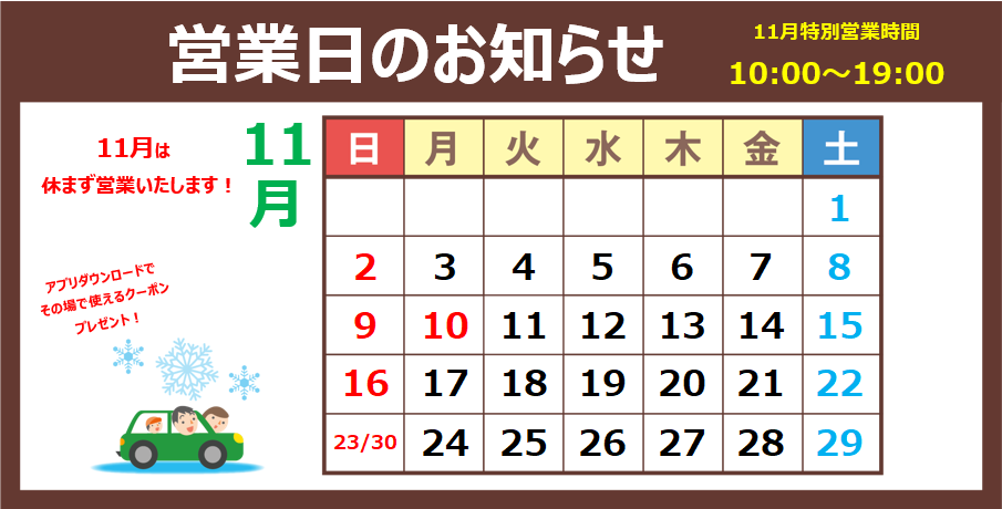 11月営業日のお知らせ 2025年10月30日 2025年 11月 営業日のおしらせです!! 11月はタイヤ交換シーズンの為、 休まず営業いたします。 また、営業時間も通常10:30~19:00のところ 11月中は 10:00~19:00といたします!! タイヤ交換シーズンとなり、店舗の混雑が予想されますので、 ご予約は早めがおススメです!! 今月もたくさんのご来店お待ちしております!!