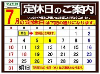 タイヤ館秋田仁井田店 のHPをご覧いただき ありがとうございます♪ 7月の定休日はこちらになります。 5日(火)/6(水)=2連休となります。 12日(火)19日(火)26日(火) ◆7月5日(火)/6日(水)は2連休となりますのでお間違えの無い様にご注意ください。◆ ーーーーーータイヤ館...