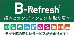 タイヤ館の新しいメンテナンスサービス。 その名も、「B-Refresh」! お客様のクルマを素敵にリフレッシュするサービスです! ・クルマの汚れが目立つ・・・ ・ニオイが気になる・・・ ・エンジンの調子が・・・ そんなお困りごと、お悩みごとを解決します! クルマに輝きとコンディションを取り戻す...