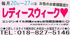 タイヤ館秋田仁井田店のスタッフ日記をご覧いただき ありがとうございます!! 当店では、女性限定でエンジンオイル交換がお得になる ★ レディースウィーク ★ をやっています!! 期間は、毎月20日~27日の7日間です!! 毎月開催しているので「エンジンオイル交換しなきゃ!」 と思っている女性の...