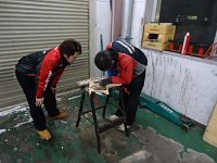 フロントバッフル製作です。 チーフがサイトウに教えながら やってます。 タイプRなので低音バリバリの為 バッフル脇に静震シートを貼り 音漏れ防止します。 本当はデットニングした方が良い のですが低予算の為・・・。 フロントドアパネルのスピーカー 部分を艶消しの黒に塗装し タイプRのイカ...