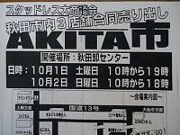 今年もやります! 秋田市内3店舗合同売り出し AKITA市!!(アキタイチ) 秋田市(あきたし)にかけてます・・・。 (-。-;) 10月1日の土曜日と 10月2日の日曜日の2日間開催!! メインは冬タイヤ早期販売ですが 在庫処分品のカー用品も展示即売! 絶対損は無い2日間ですので 是...