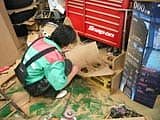 切って削って合わせて削って・・・。木屑まみれもトオリコシテ木人になるかも! (ー・-;) っていうか、まだツクルのあります! その横でチーフがレザー貼り!夜露死苦ぅ! (-_-メ)v