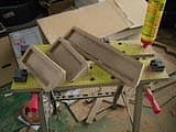 モニターの台が形になってきました。切って貼って削って真っすぐにして@%&$#。横でチーフ、タケダが空き時間にレザー貼り!月末、月初で書類関係ありますが・・・。がんばりますぅ!
