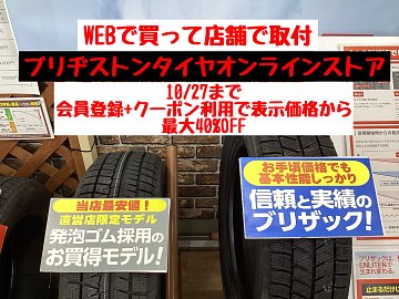ブリヂストンタイヤオンラインストアでは10/27(月)まで スタッドレスタイヤ早期履き替えキャンペーンを開催中です!! 会員登録+クーポン利用で 最大40%OFF でご購入いただけるチャンスです!! 店舗に来店するお時間のない方、ご検討のタイヤがお決まりの方、 ぜひ一度オンラインストアをご覧くだ...