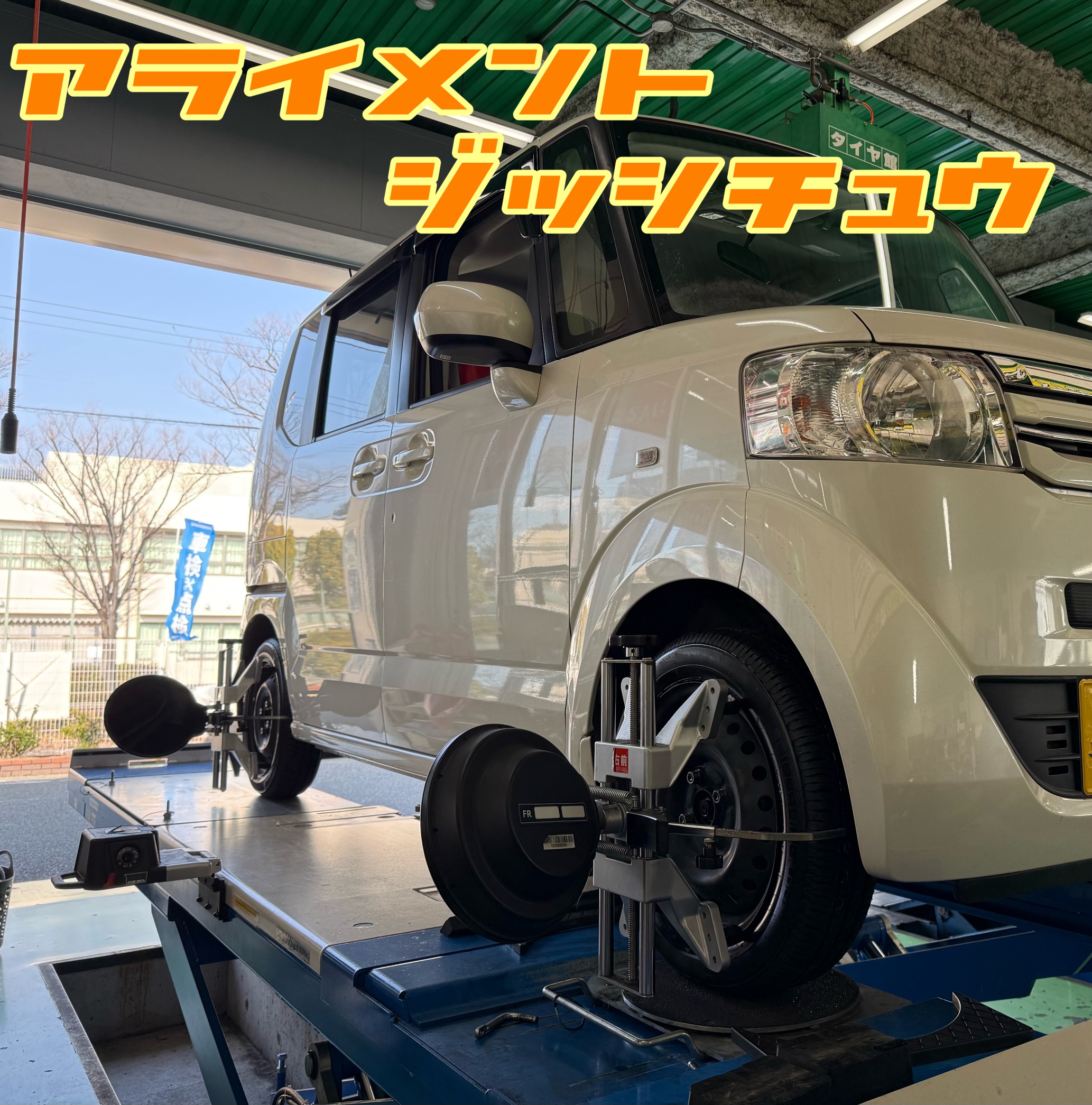 今回は『ホンダ N-BOX』にタイヤ交換とアライメント測定・調整を