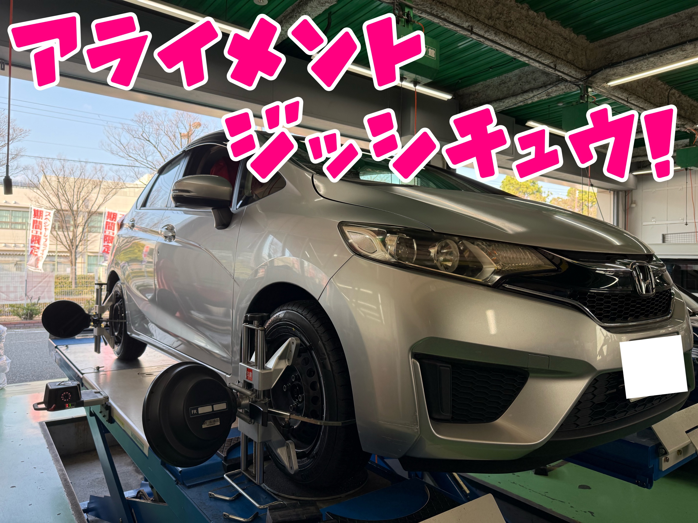 今回は『ホンダ フィット』にタイヤ交換とアライメント測定・調整を
