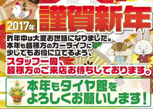 明けましておめでとうございます♪♪ ポスト 2017年1月3日 皆さん!!2017年明けましておめでとうございます(^O^)/去年もたくさんのお客様のお車のサポートをさせて頂き誠にありがとうございましたm(__)m今年もしっかり・チキン(きちん)と皆様のお車のサポートをさせて頂きますので2017年もケッコ―いい感じの『タイヤ館尼崎店』をよろしくお願いいたします( ̄ー ̄)ゞ-☆ 担当:★スタッフ一同★