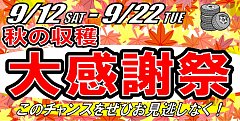 こんにちは! いつもタイヤ館尼崎店のホームページを ご覧いただきありがとうございます(#^.^#) 9月12日(土)~22日(火)まで 開催しておりましたセールは 終了いたしました☆ たくさんのお客様にご来店いただき 誠にありがとうございました! 次回のセール乞うご期待\(^o^)/