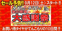 こんにちは! いつもタイヤ館尼崎店のホームページを ご覧いただきありがとうございます(#^.^#) !9月のセールご案内です! 秋の収穫大感謝祭セール 9月12日(土)~22日(火) 安心安全にシルバーウィークを お過ごしいただくために、 タイヤ・バッテリー・オイル その他メンテナンス点検承ります...