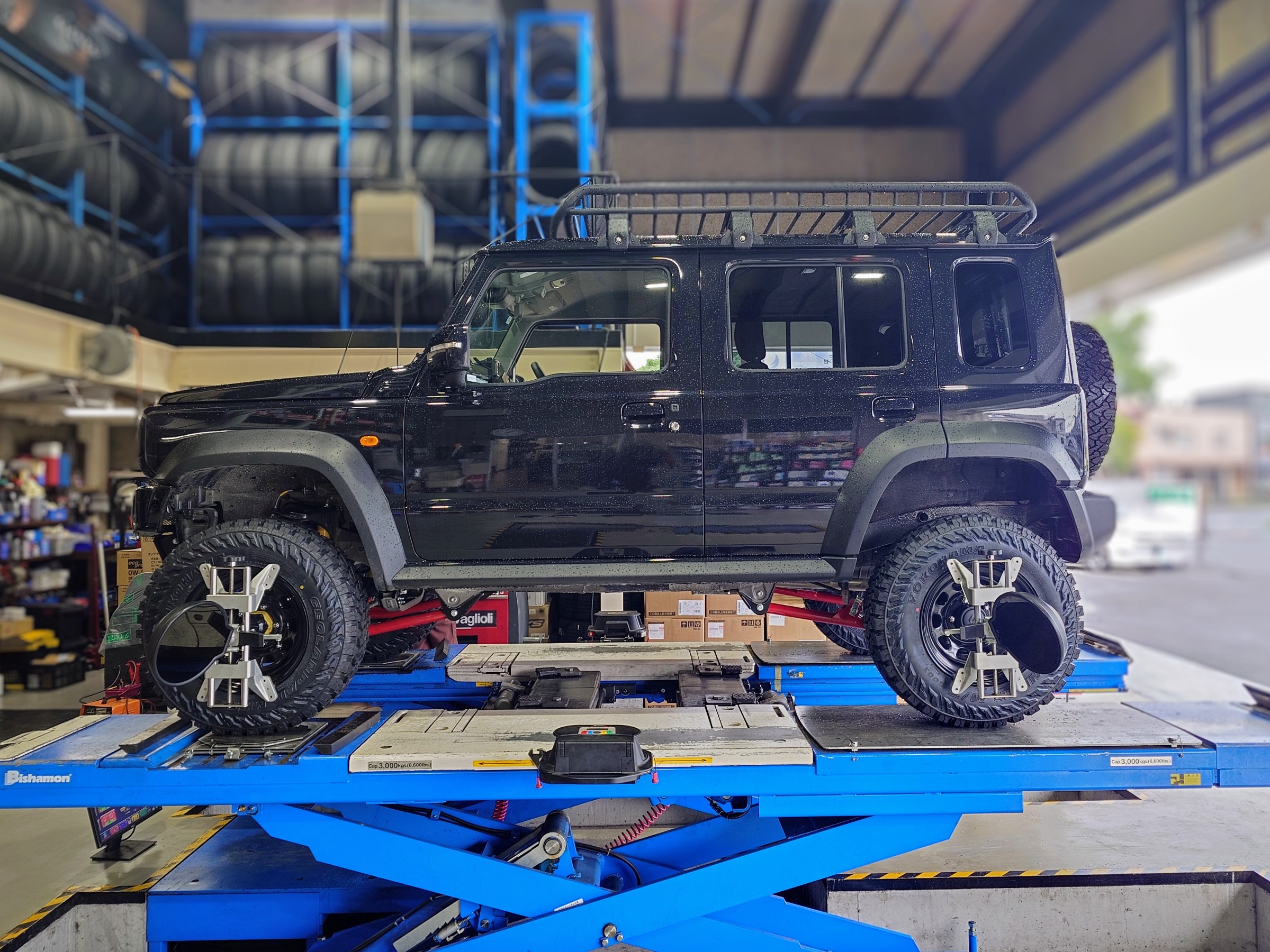 本日はリフトアップを行った新車のジムニーノマドのアライメント調整を