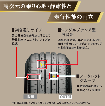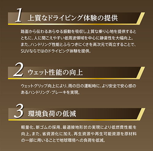 従来品「ALENZA LX100」の強みである走行中の小さな振動の吸収をさらに向上させた上で、凹凸のある路面を乗り越える際の大きな衝撃も吸収し、より上質な乗り心地を実現します。また、コーナリング時の車両の揺れを少なくし、プレミアムSUVの運動性能に求められるハンドリング性能と、ふらつきにくさを高次元で両立します。加えて、振動入力を抑えることで、荒れたアスファルト舗装路でのロードノイズを従来品対比16%低減しています。