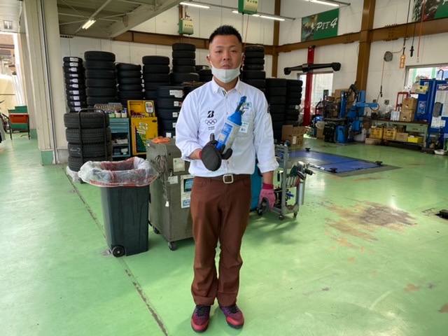 きだいくん!なにを持っているかというとタイヤWAXですね!当店ご来店時はタイヤをビカビカに輝かせますよー!