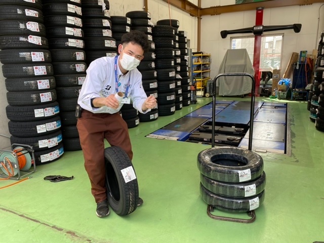 スマイルつーさん!入荷したタイヤを展示するのにラップを巻き巻き^_^