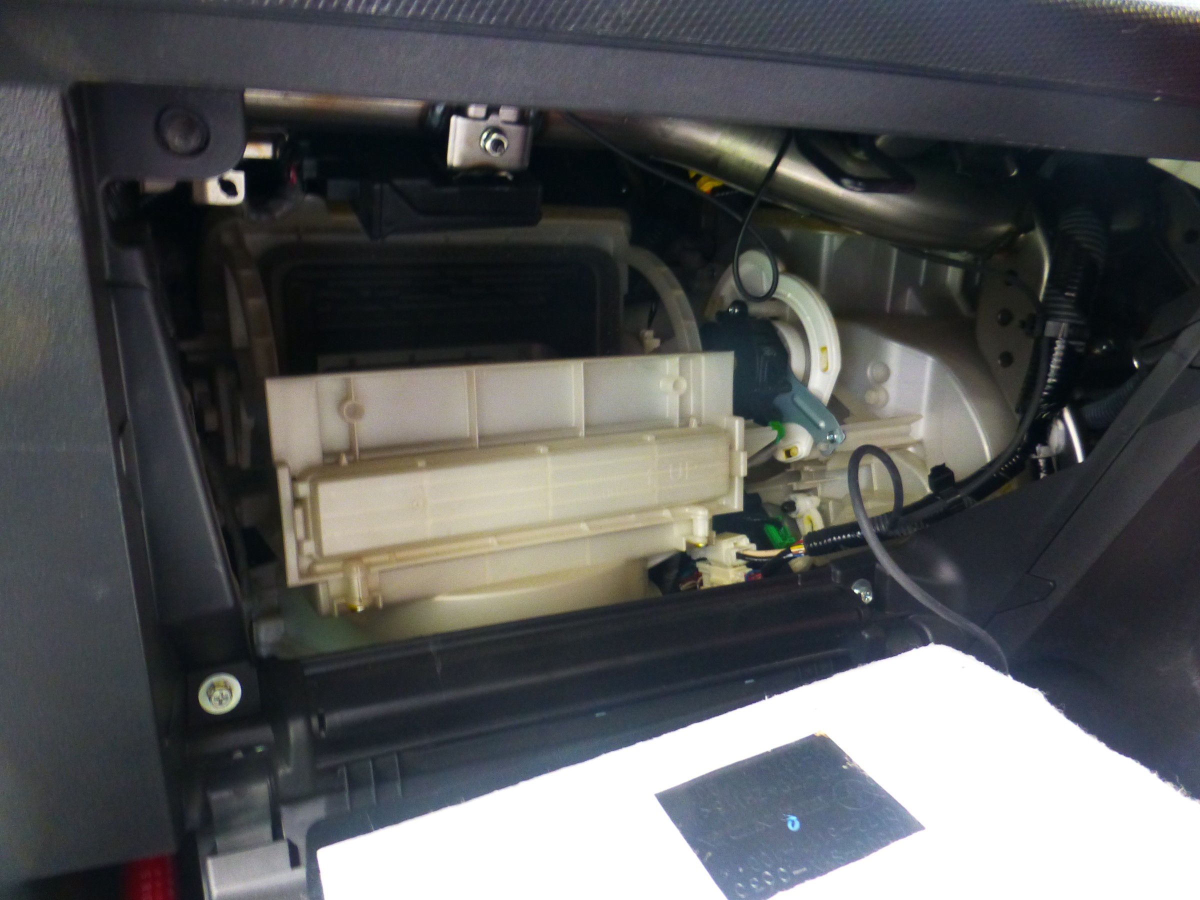 助手席側、グローブボックスを取り外すと白いボックスの中に収納されています。