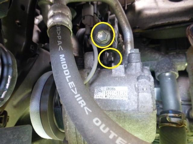 ナンバープレートを外して、A/Cコンプレッサーの