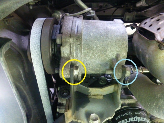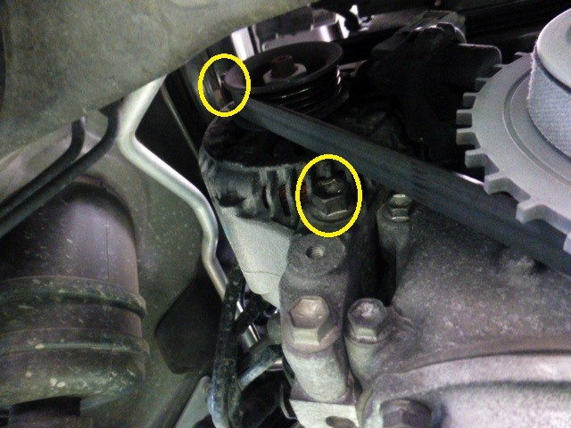 次にオルタネーター下側の固定ネジとテンショナー調整ネジを緩めて、