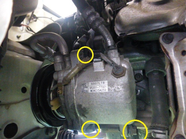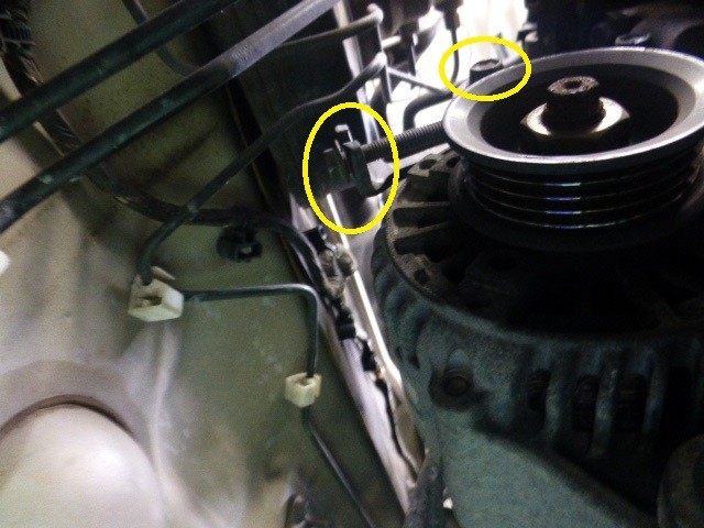 A/Cベルトは丸印のボルトを緩めて交換します。