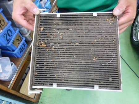 交換前のフィルターはホコリがびっしり詰まっていて、枯れ葉も入り込んでいます。