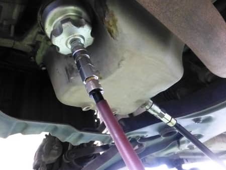 V20はオイルフィルター取り付け部より専用の洗浄剤を圧送することによって、